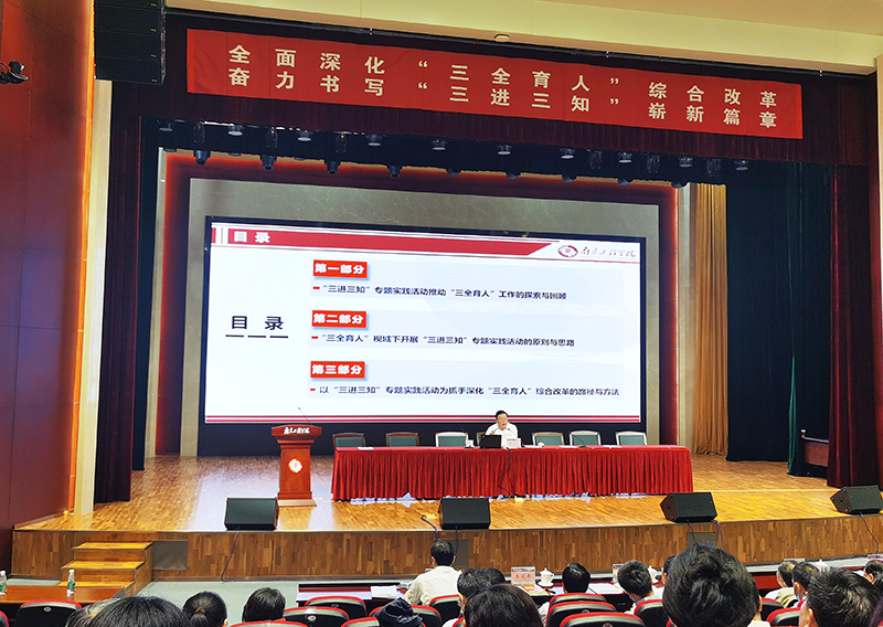 既往的工作成效为深化“三全育人”综合改革奠定了基础。如何以“三进三知”专题实践活动为抓手,确保“三全育人”综合改革落地见效?史国君书记指出,我们要以提升育人实效性为目标,以加强精准性为途径,以完善体系协同为保障,通过“三进三知”专题实践活动将“三全育人”综合改革持续推向深入。一是坚持精准思维把握正确育人航向。通过精准定位育人的履职尽责切入点和着力点,推动知识传授、能力培养与理想信念、价值理念、道德观念的教育有机结合。二是注重协同推进“十大育人体系”建设。依据《高校思想政治工作质量提升工程实施纲要》,系统推进课程、科研、实践、文化、网络、心理、管理、服务、资助、组织“十大育人体系”建设,实现思路上融合、工作上契合、资源上整合、力量上联合。三是探索育人理论实践及机制文化创新。通过理论创新,将育人实践成果凝练总结成为思想政治教育共同体校本模式与生态化育人理念。通过实践创新,实现多主体、多要素、多领域的有机融合,实现“三全育人”的合力倍增。通过机制创新,形成循环提升机制,充分激发新动力。通过文化创新,实现校园文化的创造性转化和创新性发展,形成稳定的文化生态。