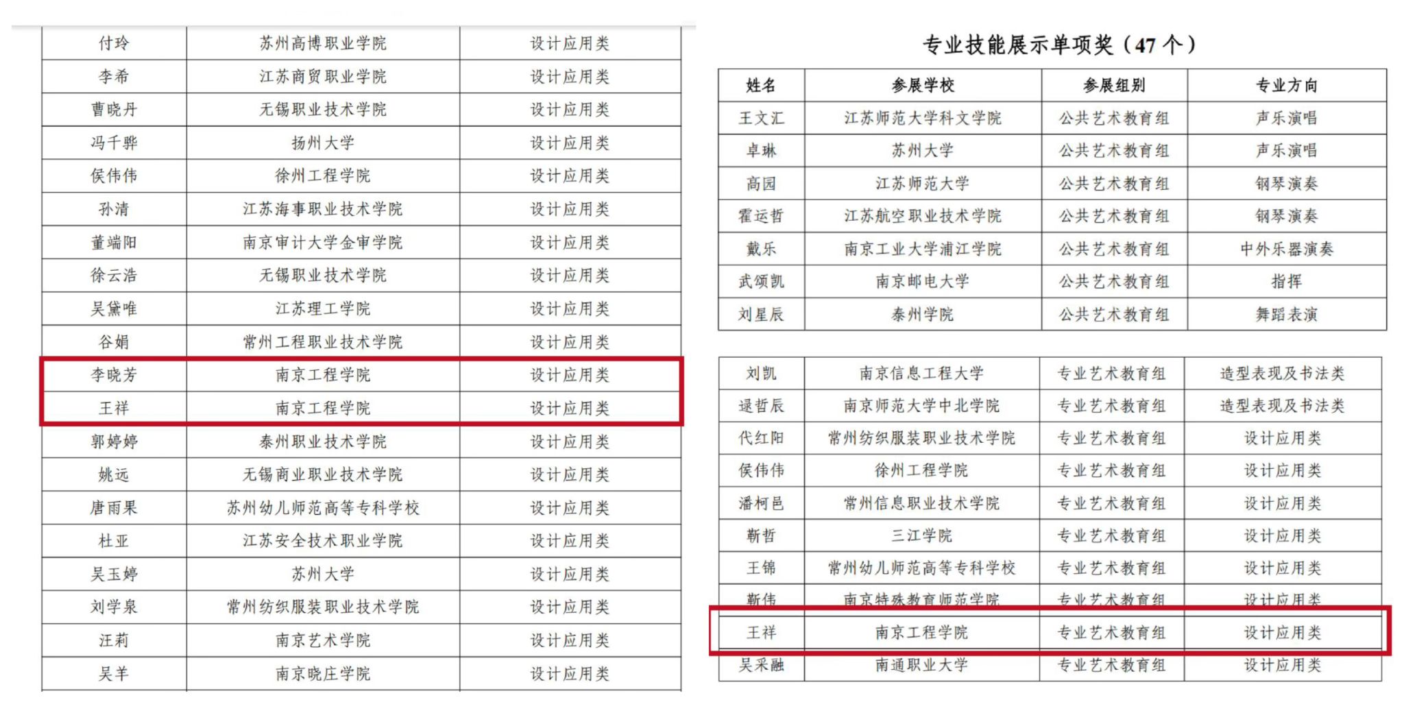 近日,省教育厅公布第三届江苏省高校艺术教师基本功展示获奖结果,经教学微课竞赛、专业技能展示、审美和人文素养展示三轮角逐,我校艺术与设计学院李晓芳、王祥两位老师凭借扎实的艺术素养和出色的教学能力,荣获个人全能赛三等奖。王祥还荣获“专业技能展示”最佳单项奖。