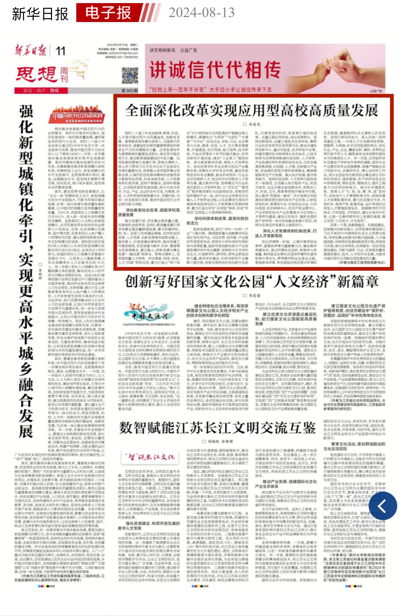 8月13日,《新华日报》思想周刊刊发我校党委书记孙爱武题为《全面深化改革实现应用型高校高质量发展》的署名文章。文章结合党的二十届三中全会精神和应用型高校发展实际,从“深化教育综合改革,赋能凯发高质量发展”“深化科技体制改革,激发科技创新活力”“深化人才发展机制体制改革,打造人才发展高地”三个方面,深刻阐述了纵深推进一流应用型高校建设的路径和方法。