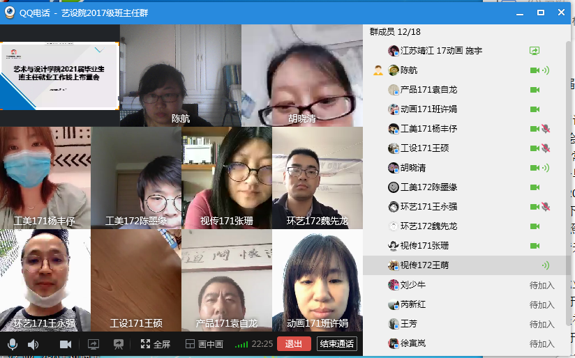 为了促使2021届毕业生更好地开展就业规划,实现在疫情复杂形势下的优质就业,7月10日下午,艺术与设计学院线上组织开展了2021届毕业生就业工作布置会。该院党委副书记胡晓清、2021届年级辅导员以及2021届全体班主任参加了会议。