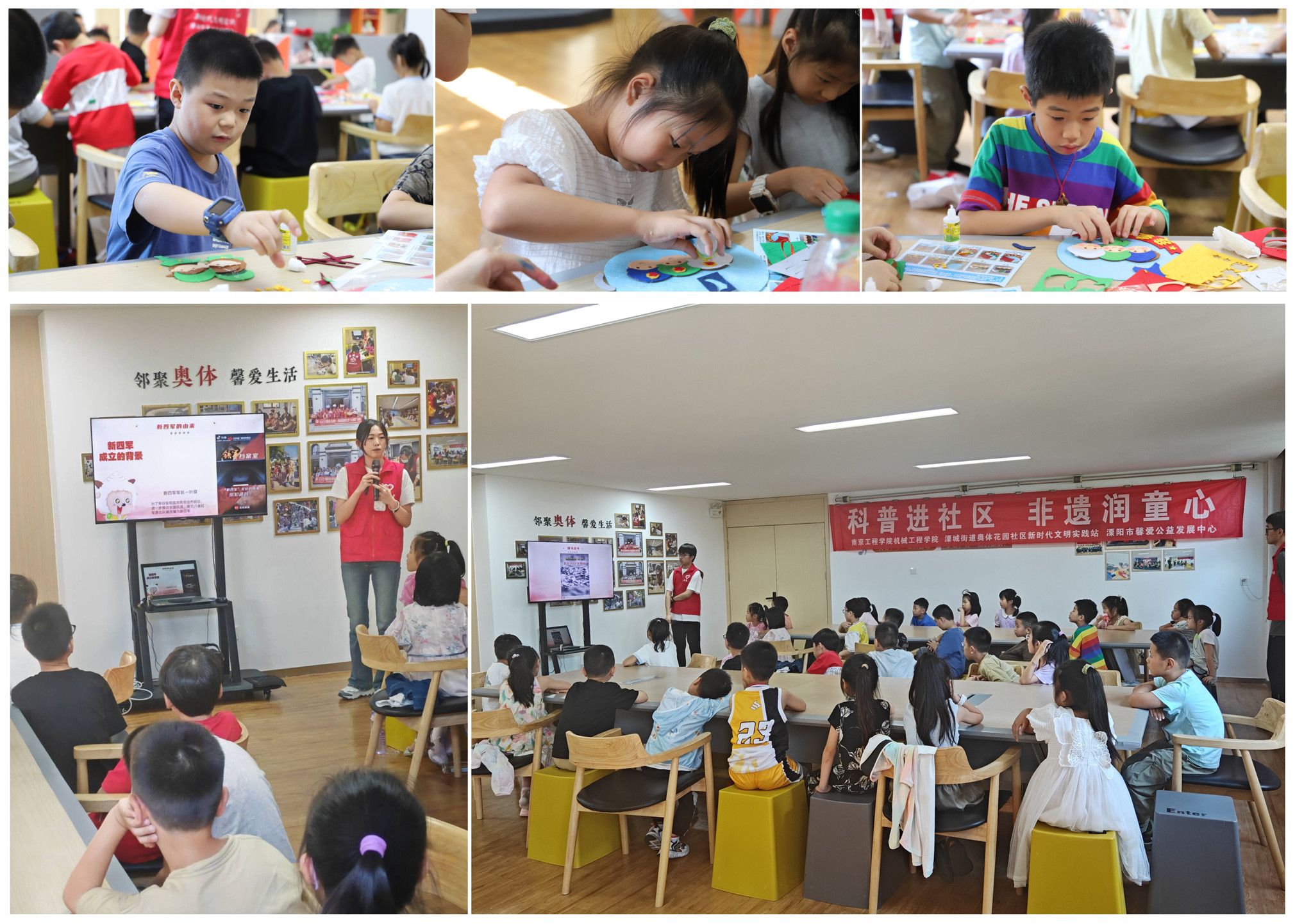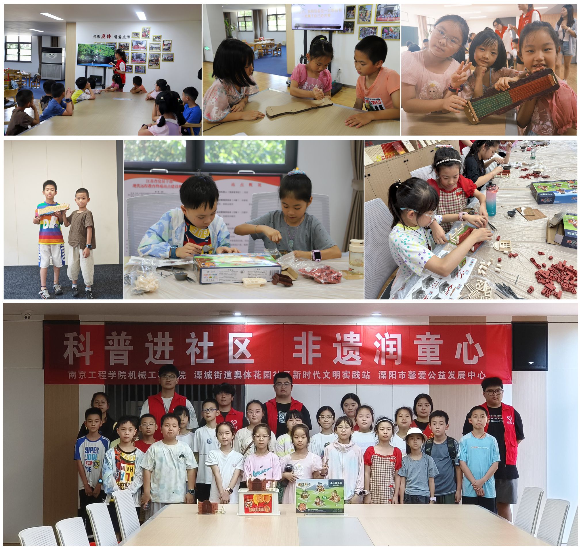 非遗传承,体验传统魅力。溧阳市具有悠久的历史和丰富的文化底蕴。志愿者们精心挑选了“焦尾琴的传说”和“溧阳明式砖作”两个当地闻名的省级非物质文化遗产,带来古韵悠远、古今传承的非遗课堂。带领小朋友们聚焦古琴的现代制做工艺和乐曲演奏,了解“明式砖作”在古迹修复和仿古建筑运用中的文化、经济价值。课堂上,孩子们还现场进行了古琴模型制作、陶艺砖块搭建的手工体验,对非遗传承人们精益求精、守正创新的工匠精神有了更加深刻的感悟。