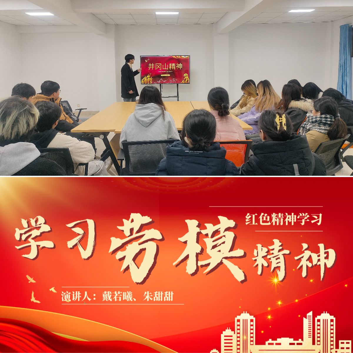 实践聚力,汲取奋进力量。学院充分发挥“一站式”学生社区及红色文化弘扬基地、爱国主义教育基地等实践教学基地作用,发挥暑期社会实践育人成效,鼓励学生挖掘生动素材、创新学习形式,开展精神谱系宣讲。环境工程232班袁郭同学结合暑期参加的“井冈情?中国梦”全国大学生暑期社会实践专项活动,走进一站式学生社区开展“井冈山精神”专题宣讲;环境工程231班戴若曦、朱甜甜同学结合主题团日活动,组织班级同学开展劳模精神学习。