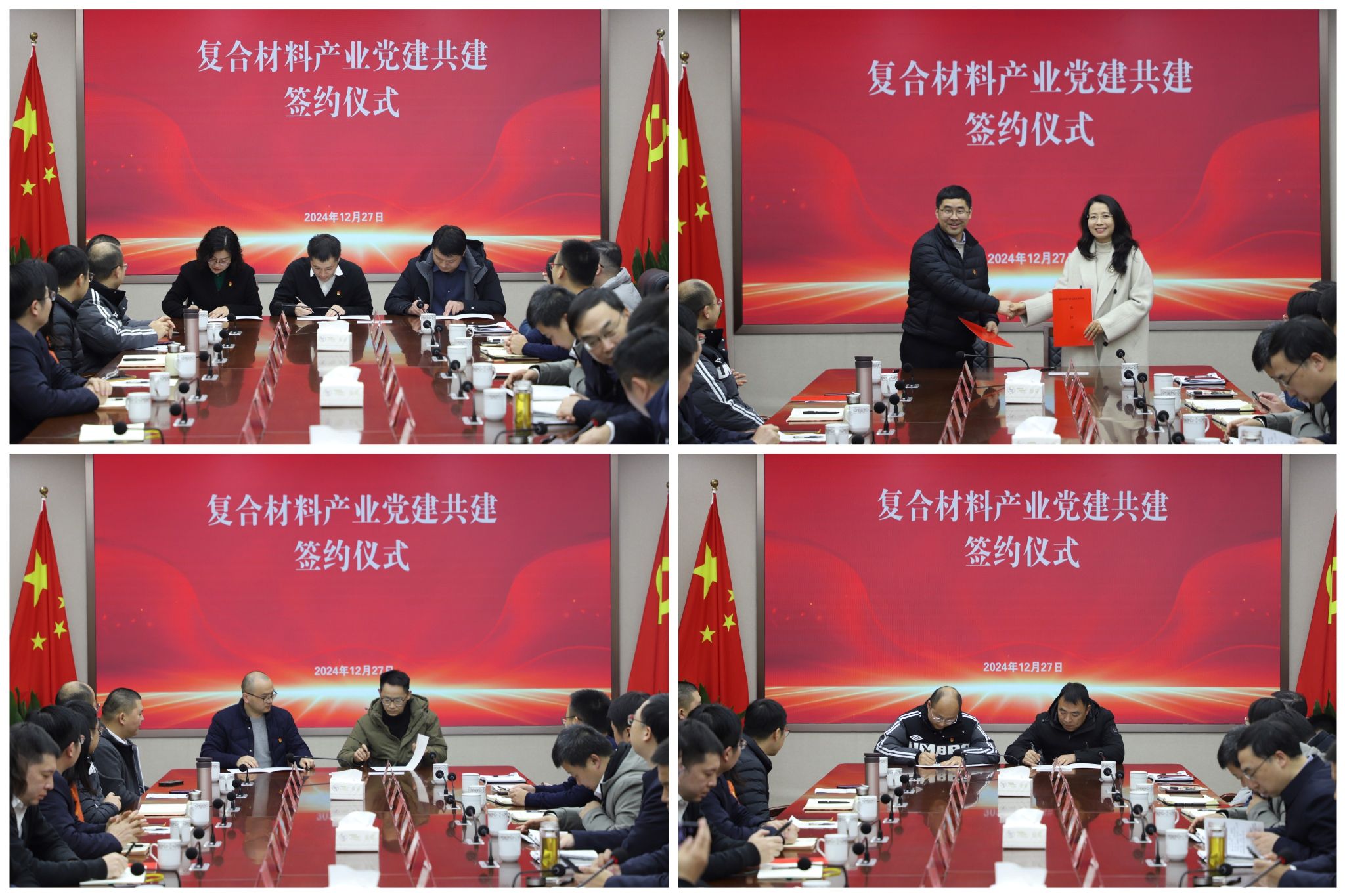 授牌签约环节,学院、学会、产业链三方书记共同为“党建共同体”揭牌,耿杰、巴志新、黎鹏共同签署了“院会地”三方党建共建协议,学院三个党建工作样板支部分别与复合材料产业链上学科相关企业签订了支部共建协议,校企双方将加强技术交流与合作,共同推动产业协同发展,实现互惠共赢。